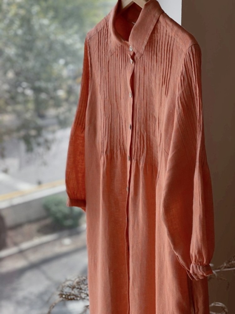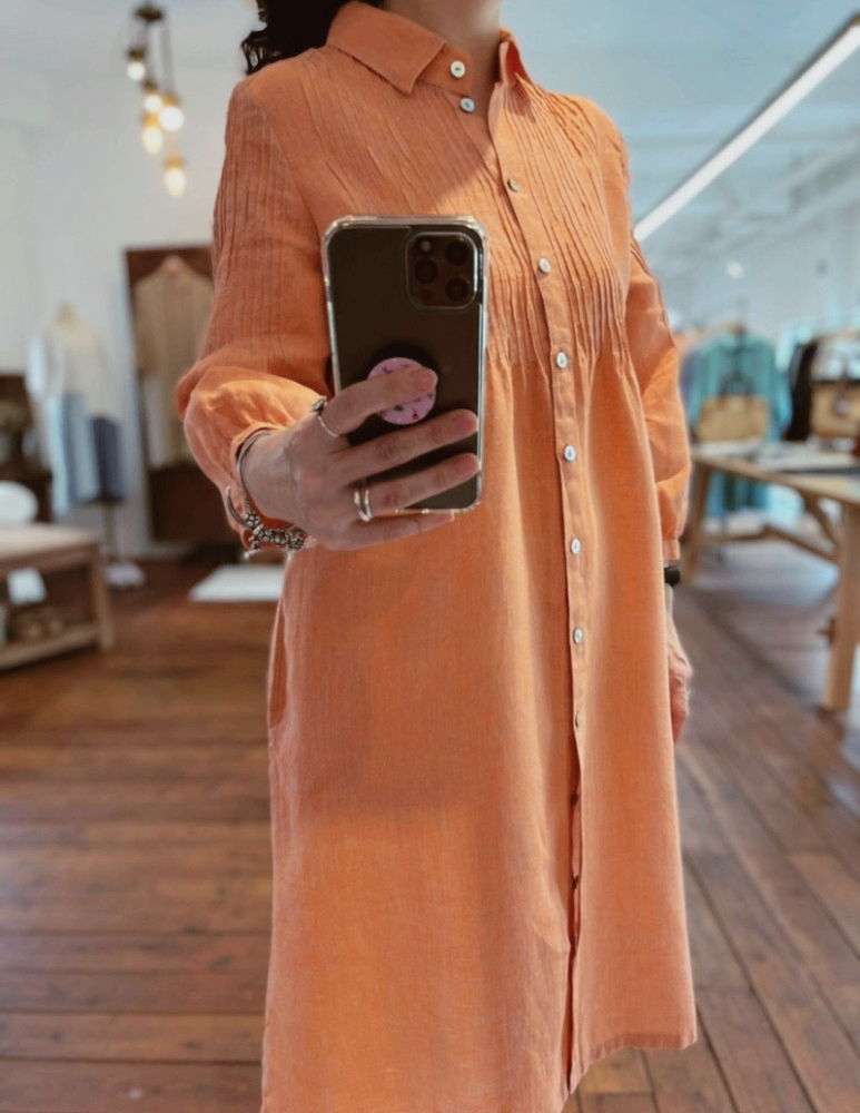 Relaxed silhouette dress with pin tuck in front, back and sleeves. Two side pockets.