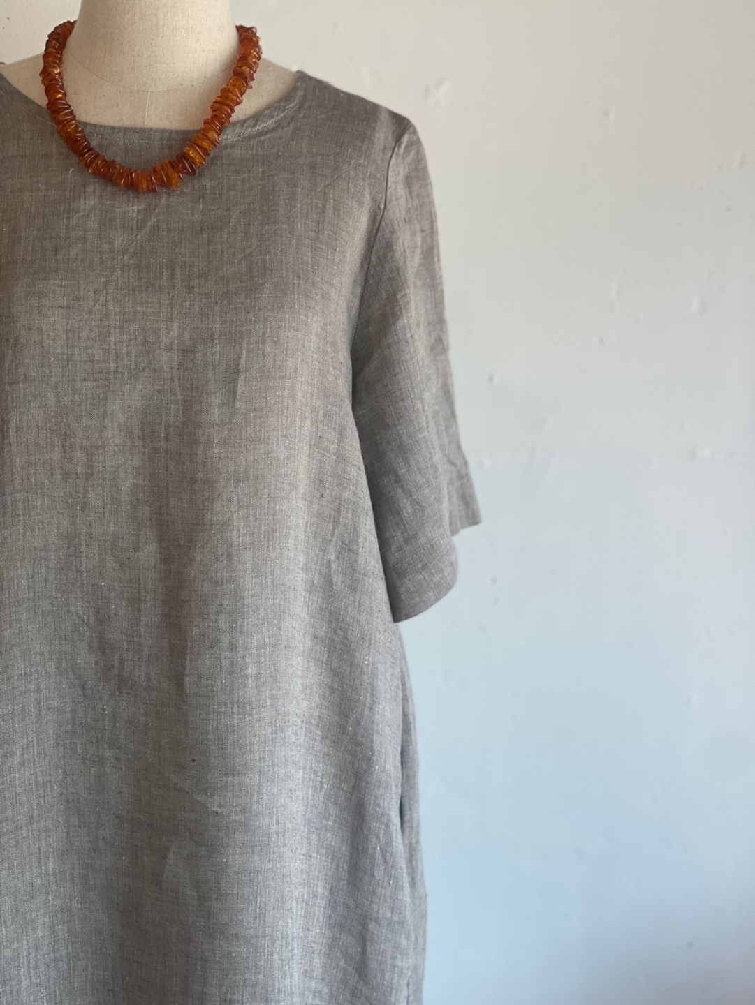 • Relaxed silhouette dress with wide pleats in back, two side pockets.